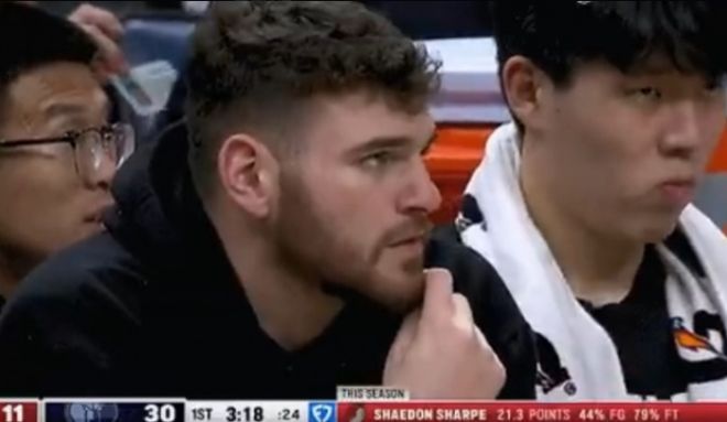 开拓者首节就挖下大坑被灰熊压制,杨瀚森不到4分钟2次犯规被换下场后努嘴,克林根因伤缺席坐在身边。