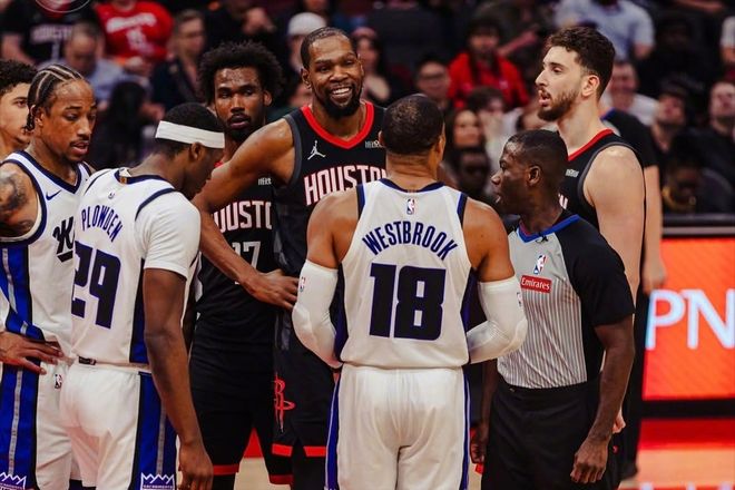 首节比赛,威少一个人17分,但国王队的其余球员合计只有5分,全队单节22分。火箭队随便在外线传导几下,就出现了大量的空位。而且火箭队一开始也没有给多少防守强度,一旦他们认真起来,国王队就直接崩盘了。眼瞅着,分差奔着30+去了。威少不甘心啊,所以一度上头,对着申京强硬犯规。正巧又碰到了赶来护队友的杜兰特,两人顺势互喷。威少不服气,或者说不愿意,不愿意看着自己所在的球队被对手戏弄。而杜兰特,知道两队的实力差距,所以只是笑着看威少。比赛结果也是如此,谈笑间,杜兰特轻松得到21分,率队击败国王,而内线的申京则是26分13篮板11助攻大号三双!