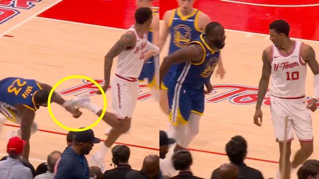 这场比赛勇士可以说是“让了半个家底”,库里、巴特勒、波尔津吉斯、穆迪和小佩顿等主力统统休战。即便如此,残阵勇士在上半场打得相当硬气,最多领先了11分。但到了第三节,火箭吹响反击号角,而点燃下半场火药味的,正是格林和火箭前锋小贾巴里-史密斯的“迷之互动”。