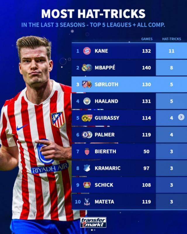 欧冠1/8决赛附加赛次回合,马竞主场4比1击败布鲁日,马竞前锋瑟尔洛特戴帽。德转列出五大联赛球员最近三个赛季在各项赛事戴帽次数榜,瑟尔洛特与哈兰德5次并列第三,凯恩11次居首。
