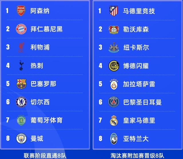 附加赛晋级8队:马竞(西甲)、勒沃库森(德甲)、纽卡(英超)、博德闪耀(挪超)、皇马(西甲)、巴黎(法甲)、亚特兰大(意甲)、加拉塔萨雷(土超)
